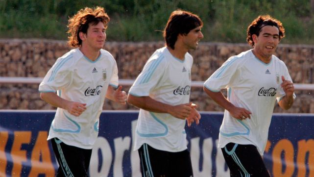 Leo Messi y Roberto Ayala en una sesión de entrenamiento de la selección de Argentina