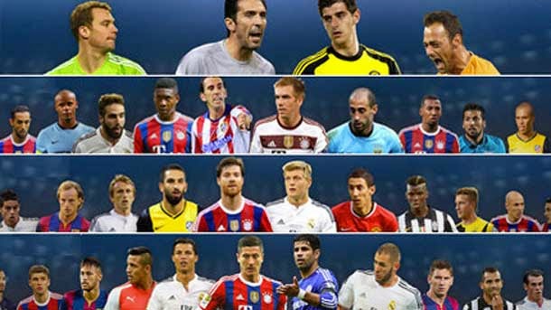 Y, en el apartado de delanteros, figuran los siguientes: Alexis (Arsenal) Bale (R.Madrid), Benzema (R.Madrid), Diego Costa (Chelsea), Ibrahimovic (PSG), Lewandowski (Borussia Dortmund), Leo Messi (FCBarcelona), Muller (Bayern Munich), Neymar (FC Barcelona), Cristiano Ronaldo (R.Madrid), Jonathan Soriano (Salzburg) y Tevez (Juventus).