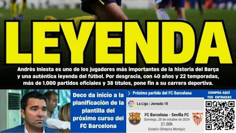 Portada de FC BARCELONA NOTICIAS del MIÉRCOLES 9 de OCTUBRE de 2024: Andrés Iniesta es uno de los jugadores más importantes de la historia del FC Barcelona y una auténtica leyenda del fútbol. Por desgracia, con 40 años, 22 temporadas, más de 1.000 partidos oficiales y 38 títulos, pone fin a su carrera.