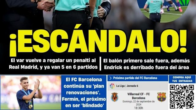 Portada de FCBN del domingo 22 de septiembre de 2024: El Barcelona de Flick ya está avisado, el Madrid viene lanzado y viendo los arbitrajes difícilmente perderá algún partido. Contra el Espanyol, los de Ancelotti sumaron su quinto penalti a favor en las primeras seis jornadas. ¡Un escándalo!