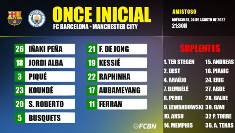 - XI del FC Barcelona: Iñaki Peña; Sergi Roberto, Koundé, Piqué, Jordi Alba; Busquets, Frenkie de Jong, Kessié; Raphinha, Aubameyang, Ferran.