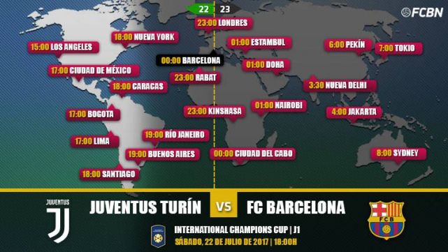Fútbol Club Barcelona y Juventus de Turín se enfrentan en el Metlife Stadium de Nueva York el sábado 22 de julio a las 18:00 horas (00.00 en España). El encuentro corresponde a la primera jornada de la International Champions Cup 2017 y será el estreno del nuevo Barça de Valverde en una pretemporada de máxima exigencia: 3 partidos en 10 dias, contra Juventus, Manchester United y Real Madrid.