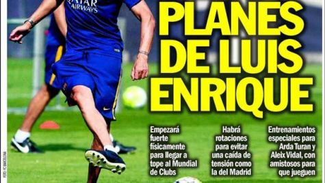 Portada del diario Sport, viernes 17 de julio de 2015. Empezará fuerte físicamente para llegar a tope al Mundial de Clubs. Habrá rotaciones para evitar una caída de tensión como la del Real Madrid. Entrenamientos especiales para Turan y Aleix Vidal, con amistosos para que jueguen.