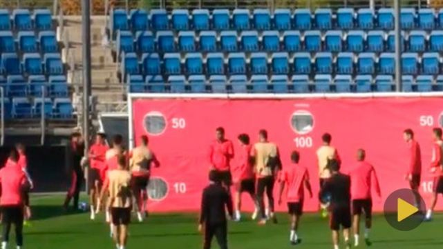 El primer balonazo se le marcha alto, pero en el segundo sí acierta a la hora de dar en las piernas del joven jugador del Real Madrid, que pasa la escena con cara de circunstancias, más o menos como sucedió en su día con Neymar Jr y Semedo en un entrenamiento del FC Barcelona.