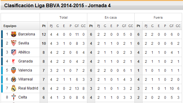 Ni los más optimistas imaginaban un arranque de la Liga como este. En solo cuatro jornadas, el Barça de Luis Enrique ha sido capaz confirmar las buenas sensaciones futbolísticas y lograr un pleno de victorias que, junto a los pinchazos de Atlético de Madrid, vigente campeón, y Real Madrid, le colocan en lo más alto de la tabla. Los culés lideran la clasificación con 12 puntos, seguidos del Sevilla (10 puntos), Atlético y Granada (8 puntos), Valencia y Villarreal (7 puntos, pero el Valencia con un partido menos) y Real Madrid (6 puntos). Una ventaja que no es definitiva, pero que ayuda a afrontar la nueva temporada desde la tranquilidad que dan los buenos resultados.