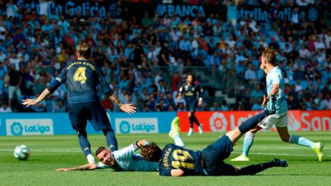 Corría el tiempo añadido del primer periodo cuando Odriozola, lateral del Real Madrid, perdió un balón inexplicable en su propia área. Iago Aspas, estrella del Celta, recibió la pelota y recibió por detrás un penalti muy claro del propio lateral vasco, que intentaba solucionar su gravísimo error defensivo.