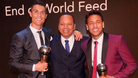 Cristiano Ronaldo, flamante ganador, y Neymar Jr, separados únicamente por el padre del paulista, complemento inseparable de su hijo. Fueron muchos los que no entendieron que el delantero del Paris Saint Germain entrara en una imagen que podría dar lugar a especulaciones y a polémicas, porque ha dado barra libre a los rumores que le sitúan en el Real Madrid.