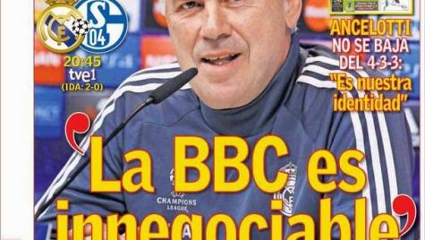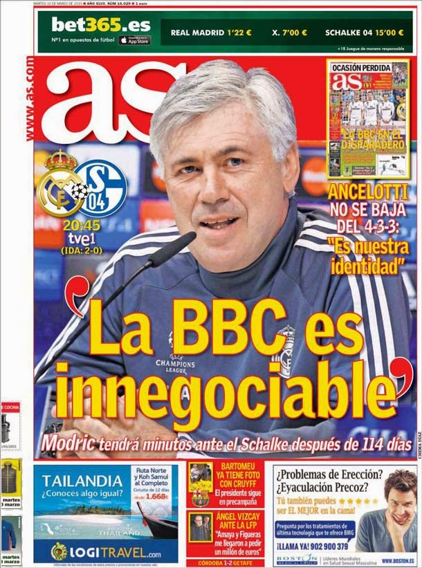 Portada del periódico AS, martes 10 marzo 2015. Ancelotti no se baja del 4-3-3: "Es nuestra identidad. La BBC es innegociable". Modric tendrá minutos ante el Schalke 114 días después.