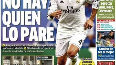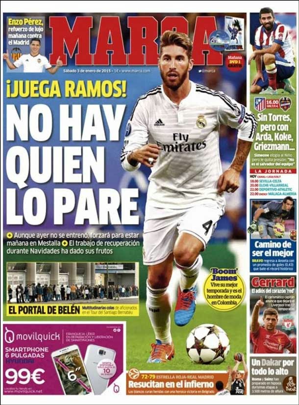 Portada del periódico Marca, sábado 3 de enero de 2015. ¡Juega Ramos! Aunque ayer no se entrenó, forzará para estar mañana en Mestalla. El trabajo de recuperación ha dado sus frutos.