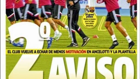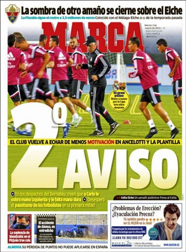 Portada del periódico Marca, martes 3 marzo 2015. El club vuelve a echar de menos motivación en Ancelotti y la plantilla. En los despachos del Bernabéu creen que a Carlo le sobra mano izquierda y le falta mano dura. Desesperó el pasotismo de los futbolistas en la primera mitad.