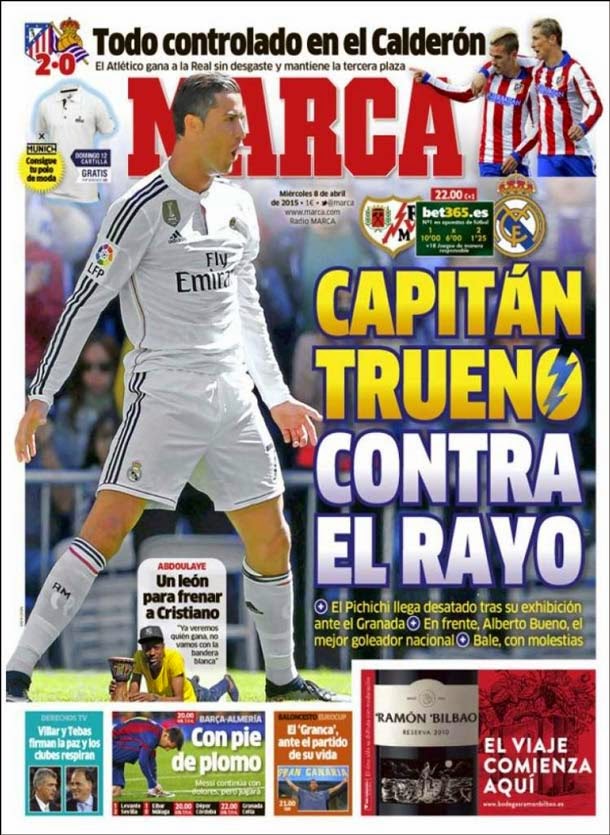 Portada del periódico Marca, miércoles 8 de abril de 2015. El Pichichi llega desatado tras su exhibición contra el Granada. En frente, Alberto Bueno, el mejor goleador nacional.