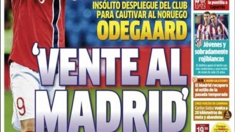 Portada del periódico Marca, viernes 9 de enero de 2015. ¡Locos por un niño de 16 años! Insólito despliegue del Real Madrid para cautivar al noruego Odegaard.