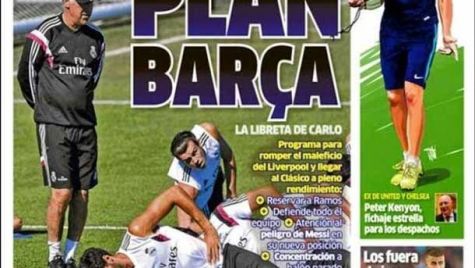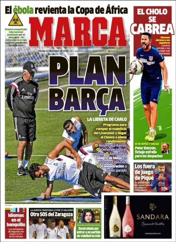 Portada Marca, viernes 17 de octubre de 2014. La libreta de Carlo: programa para romper el maleficio del Liverpool y llegar al Clásico a pleno rendimiento.