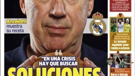 Portada del periódico Marca, viernes 20 febrero 2015. Ancelotti muestra su receta: "En una crisis hay que buscar soluciones, no culpables". "Ha Cristiano hay que hablarle poco y dejarle jugar".