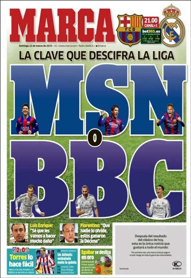 Portada del periódico Marca, domingo 22 de marzo de 2015. La clave que descifra la Liga: MSN o BBC. Luis Enrique: "Sé que les vamos a hacer mucho daño".