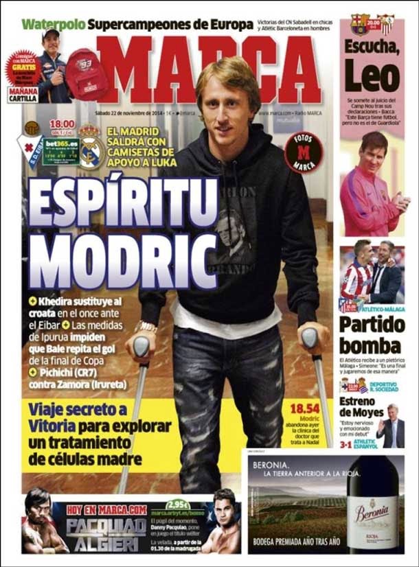 Portada Marca, sábado 22 de noviembre de 2014. El Madrid saldrá con camisetas de apoyo a Luka. Khedira sustituye al croata en el once ante el Eibar. Las medidas de Ipurúa impiden que Bale repita el gol de la final de Copa. Pichichi (CR7) contra Zamora (Irureta).