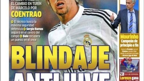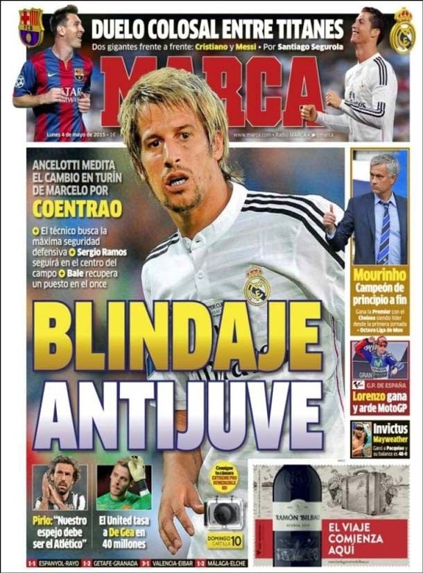 Portada del periódico Marca, lunes 4 de mayo de 2015. Ancelotti medita el cambio en Turín de Marcelo por Coentrao. El técnico busca la máxima seguridad defensiva.