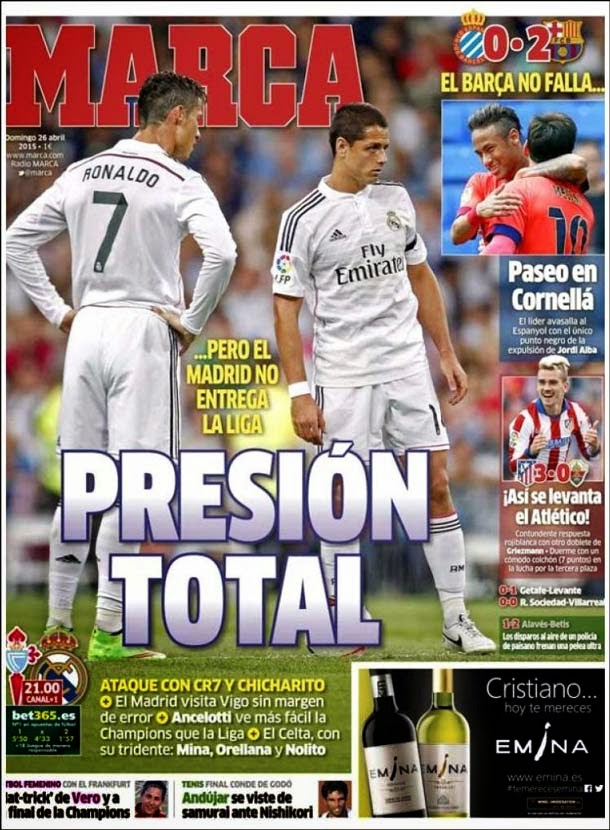 Portada del periódico Marca, domingo 26 de abril de 2015. El Barça no falla... pero el Madrid no entrega la Liga. Ancelotti ve más fácil ganar la Champions que la Liga.