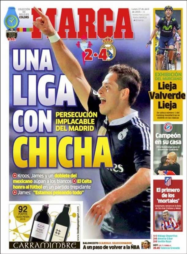 Portada del periódico Marca, lunes 27 de abril de 2015. Persecución implacable del Real Madrid. Kroos, James y un doblete del mexicano aúpan a los blancos.