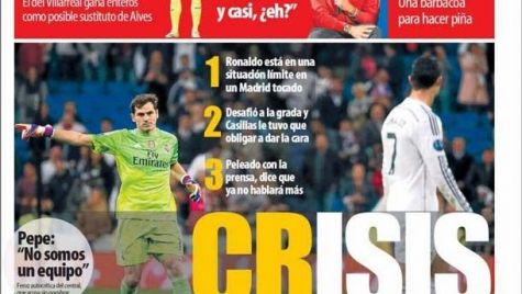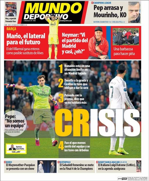 Portada del periódico Mundo Deportivo, jueves 12 marzo 2015. Ronaldo está en una situación límite en un Madrid tocado. Desafió a la grada y Casillas le tuvo que obligar a dar la cara. Peleado con la prensa, dice que no hablará más. Fue el que menos corrió del equipo y se las tuvo con Arbeloa.