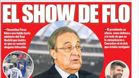 Portada del periódico Mundo Deportivo, viernes 4 de diciembre de 2015. Florentino Pérez lidera una huida hacia delante del Real Madrid que insiste en que no cometió ninguna infracción. El presidente se aferra, como defensa, a la tesis de que no le comunicaron a Cheryshev ni al club que estaba castigado.