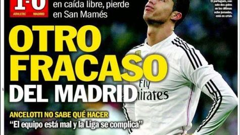 Portada del periódico Sport, domingo 8 marzo 2015. El equipo blanco, en caída libre, pierde en San Mamés. Una victoria en la sesión matinal situaría al Barça un punto por encima del Madrid.