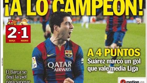 Portada del periódico Sport, lunes 23 de marzo de 2015. El Barça se dejó la piel para superar a un Madrid muy intenso. A 4 puntos: Suárez marcó un gol que vale media Liga.