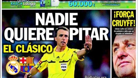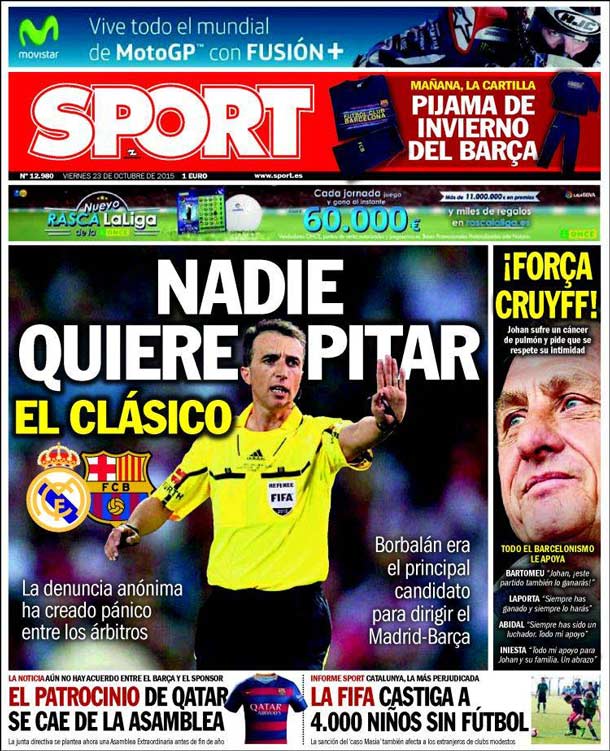 Portada del diario Sport, viernes 23 de octubre de 2015. La denuncia anónima ha creado pánico entre los árbitros. Borbalán era el principal candidato para dirigir el Madrid-Barça.