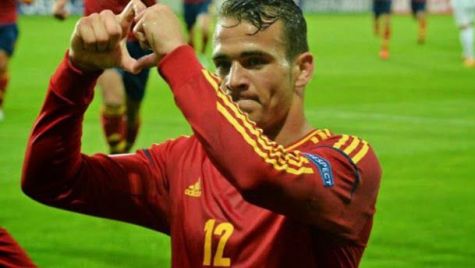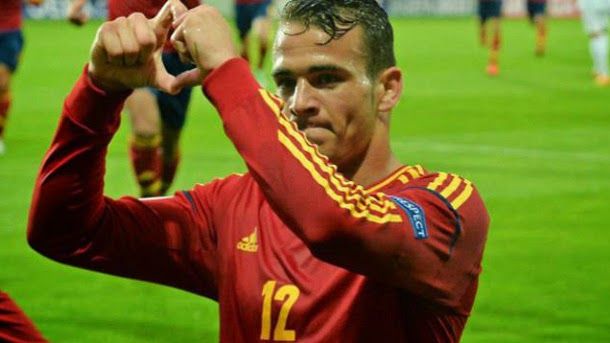 Una de las jóvenes promesas del FC Barcelona de Luis Enrique y autor del gol de la victoria en el campo del Villarreal, Sandro Ramírez, ha marcado un gol de bella factura en el último entrenamiento de la selección española Sub-21, de espuela y en el aire