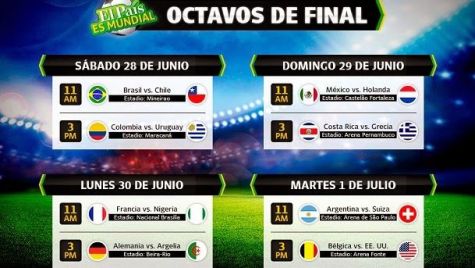 Ya está totalmente configurado el cuadro de octavos de final del Mundial de Brasil 2014. Las eliminatorias se disputarán los días 28, 29 y 30 de junio, y el martes 1 de julio. Los duelos son los siguientes: Brasil-Chile, Colombia-Uruguay, Holanda-México, Costa Rica-Grecia, Francia-Nigeria, Alemania-Argelia, Argentina-Suiza y Bélgica-Estados Unidos