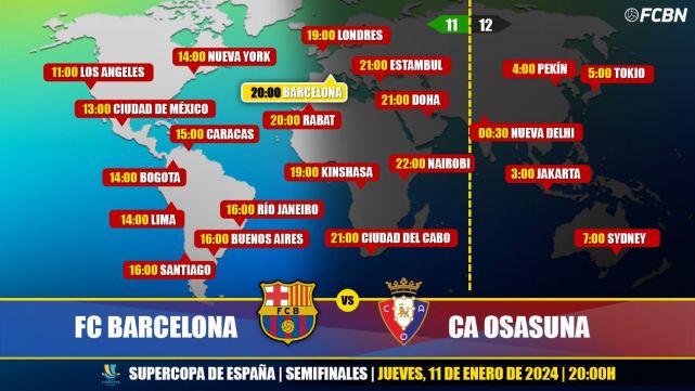 En Estados Unidos, el partido de Supercopa de España 2023-2024 entre FC Barcelona y CA Osasuna puede verse en vivo a partir de las 14:00 horas (2:00 PM, Washington) y las 11:00 horas (11:00 PM, Los Ángeles) a través de ESPN+, ESPN 2 y ESPN App. En Sudamérica, Centroamérica, Caribe, México y Brasil, el partido FC Barcelona contra CA Osasuna podrá verse en vivo a través de los siguientes horarios y canales de televisión: DSports, DGO, Star+ y ESPN (Sólo Brasil), SKY Sports y Tigo Sports +.